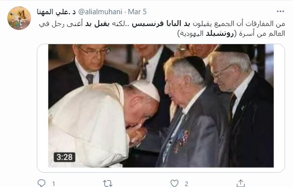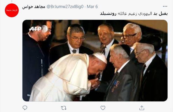 الوقائع: التشارك في الصورة تكثّف أخيرا، عبر حسابات، لا سيما في تويتر (هنا، هنا...). وقد ارفقت بالمزاعم الآتية (من دون تدخل أو تصحيح): "البابا فرنسيس يقبل يد اليهودي زعيم عائله روتشيلد"، وايضا "البابا فرنسيس يقبل يد أغنى رجل في العالم من أسرة (روتشيلد اليهودية)".