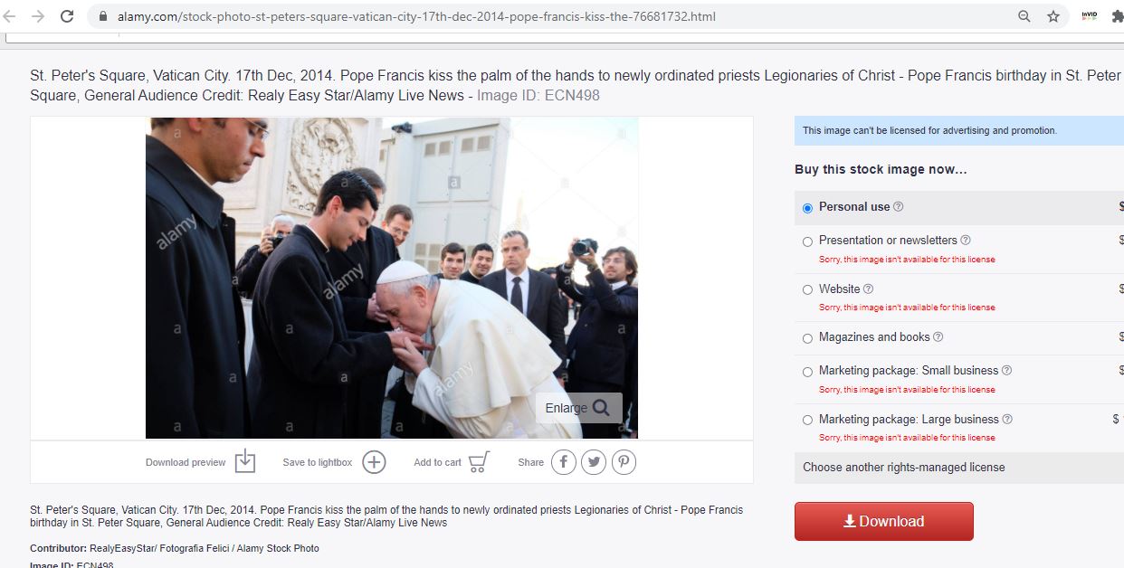 وفي 17 كانون الاول 2014، التقطت للبابا فرنسيس صورة (وهنا ايضا) وهو "يقبل راحات ايدي كهنة رُسِموا حديثا"، في ساحة القديس بطرس في الفاتيكان.