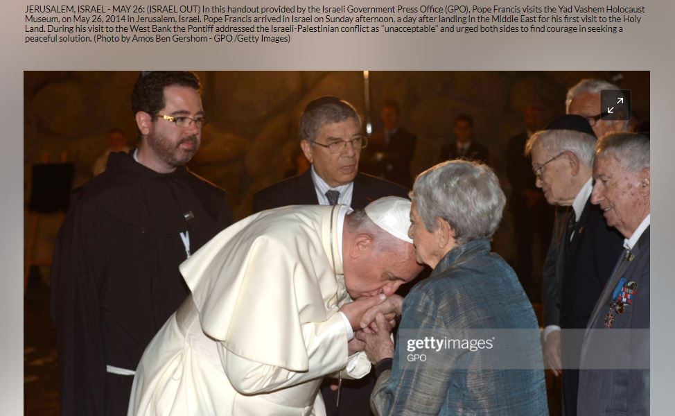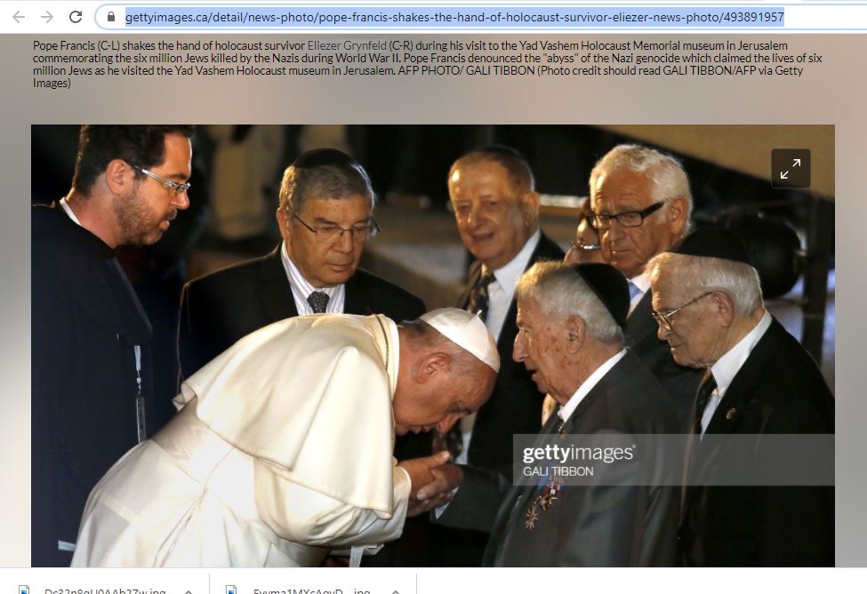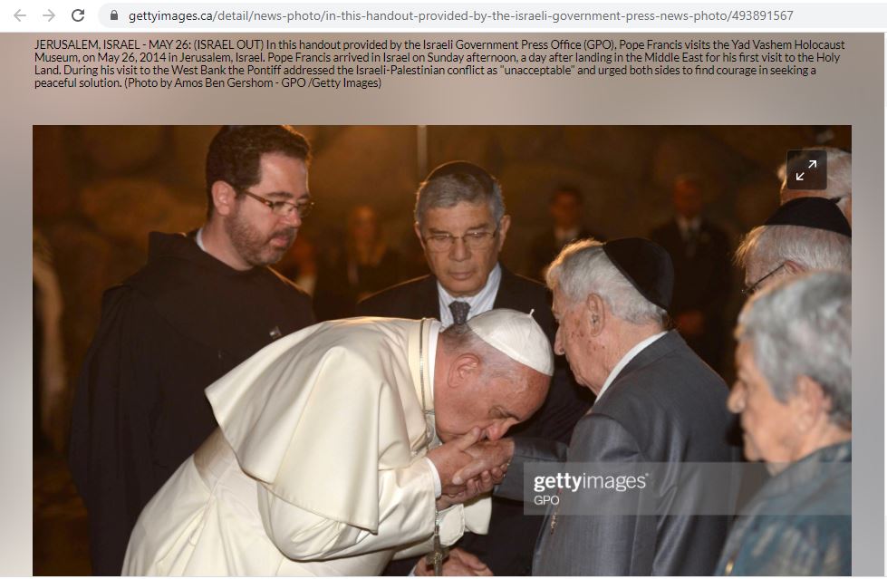 في واقع الامر، ينشر موقع Getty Images صورا اخرى للبابا فرنسيس مقبلا يد غرينفيلد وناجين آخرين من المحرقة (هنا، هنا، هنا، هنا).