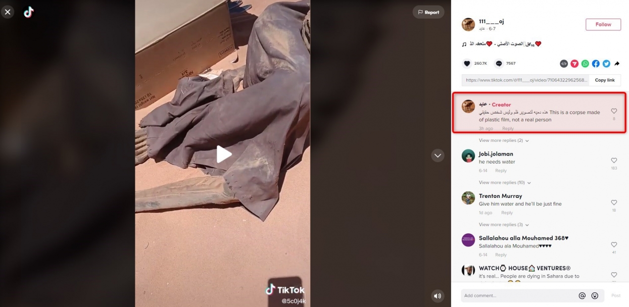 وأوضح صاحب الحساب في تعليقات عدّة على الفيديو أنّ ما يظهر فيه هو دمية بلاستيكيّة تستخدم في التصوير.