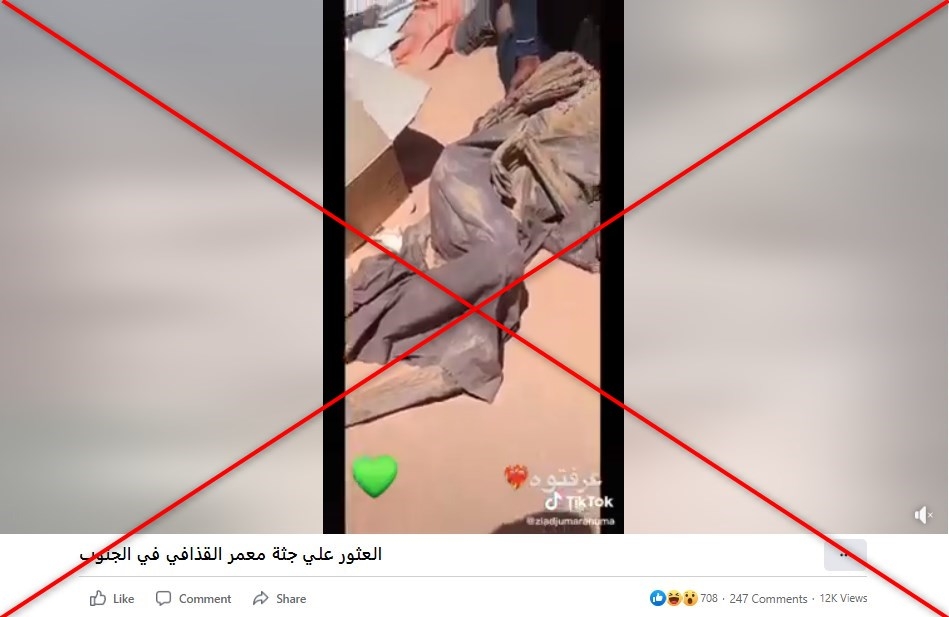يتداول مستخدمون لمواقع التواصل الاجتماعي فيديو يدّعي ناشروه أنّه يظهر "العثور على جثّة العقيد الليبي معمّر القذافي" الذي قتل عام 2011. إلا أنّ ما يظهر في المقطع المصّور في الحقيقة هو مجرّد دمية تستخدم في تصوير الأفلام.