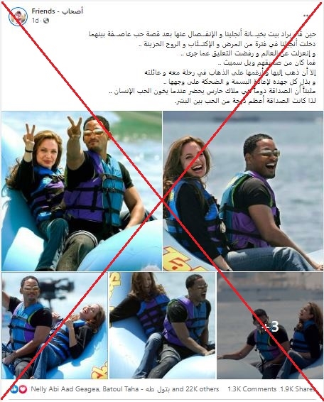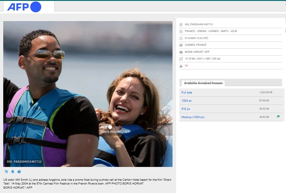 يتداول مستخدمون لمواقع التواصل الاجتماعي مجموعة صور يدّعي ناشروها أنها من رحلة قام بها الممثل ويل سميث برفقة أنجلينا جولي بهدف إخراجها من حالة الاكتئاب التي تسبب بها انفصالها عن براد بيت. إلا أنّ هذه الصور ملتقطة في العام 2004، أي قبل طلاق بيت وجولي بأكثر من 10 سنوات، خلال مهرجان كانّ للترويج لفيلم "شارك تايل".