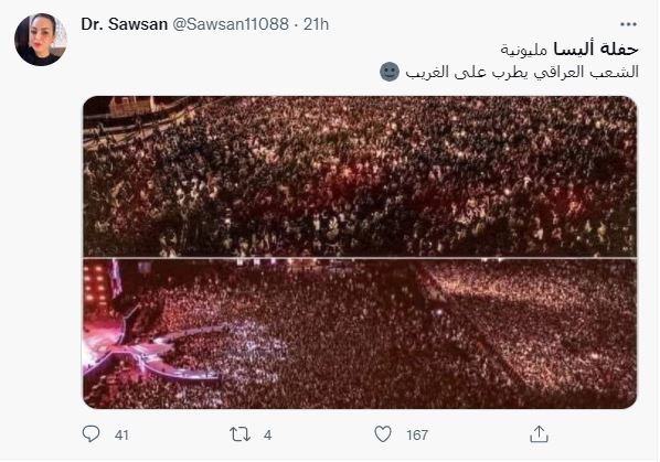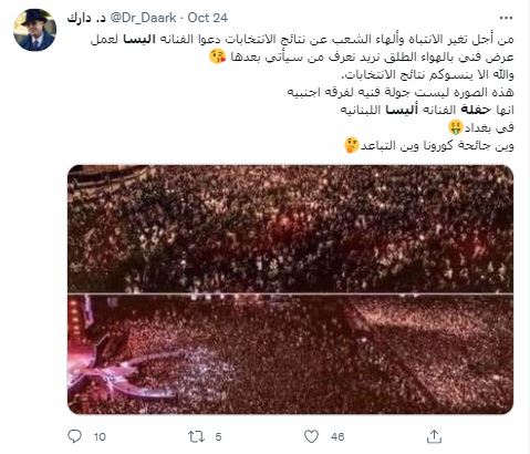 النتيجة: اذاً، لا صحة للمزاعم ان الصورتين المتناقلتين تعودان الى حفلة النجمة اللبنانية إليسا في بغداد، في 22 تشرين الاول 2021. الصورتان لقطتان من الحفلة الغنائية للنجم المصري تامر حسني في مركز المنارة في القاهرة، في 14 تشرين الاول 2021.