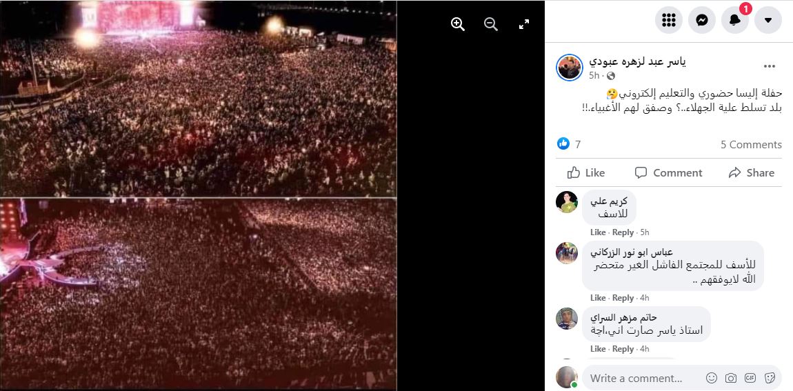 الوقائع: التشارك في الصورتين يتكثف عبر صفحات وحسابات، في الفايسبوك (هنا، هنا، هنا، هنا، هنا، هنا، هنا...)، وتويتر (هنا، هنا، هنا، هنا، هنا...). وقد أرفقتا بالمزاعم الآتية (من دون تدخل أو تصحيح): "فقط في العراق"، "حفلة إليسا حضوري والتعليم إلكتروني"، وايضا "حفلة أليسا مليونية الشعب العراقي يطرب على الغريب"...