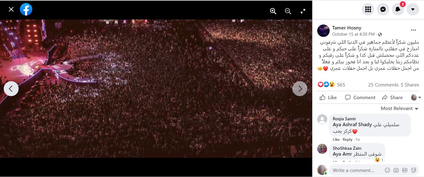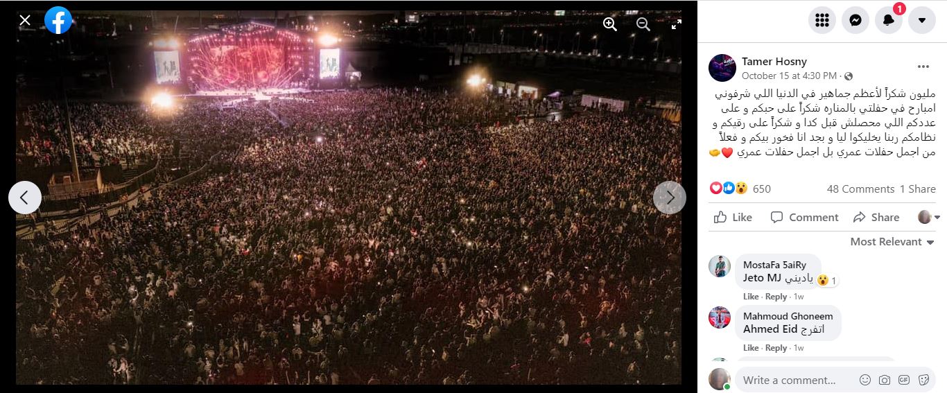 فالبحث العكسي عن الصورتين، بواسطة غوغل، يوصلنا الى الفنان المصري تامر حسني، الذي نشرهما في صفحته في الفايسبوك في 15 تشرين الاول 2021 (هنا، هنا) ضمن مجموعة أخرى من الصور "لحفلته في المنارة"، على ما كتب.