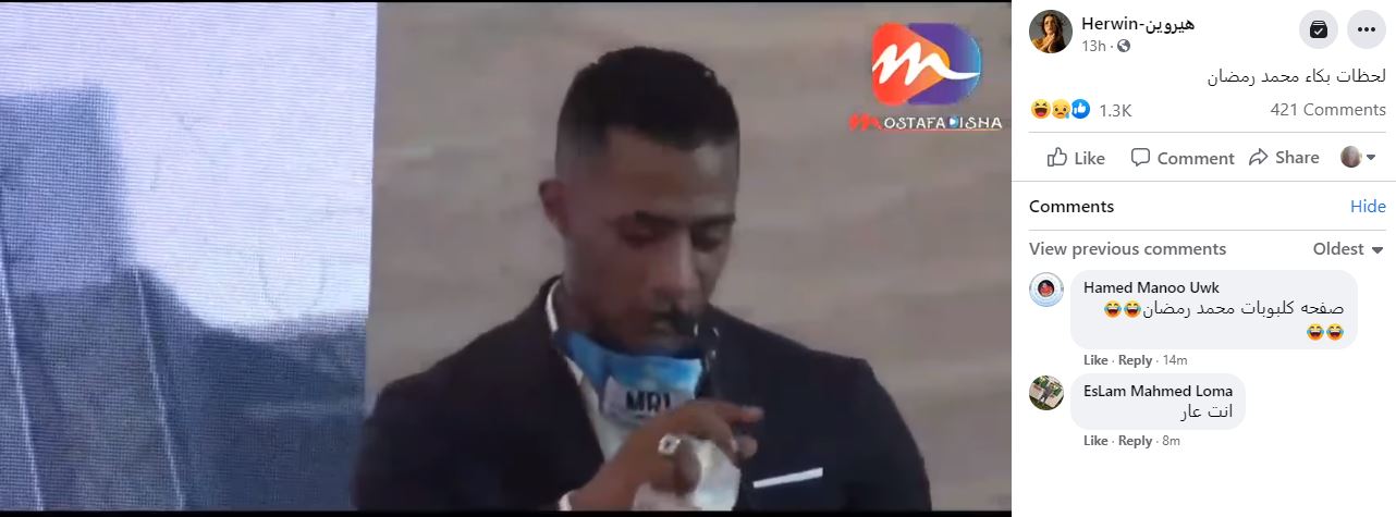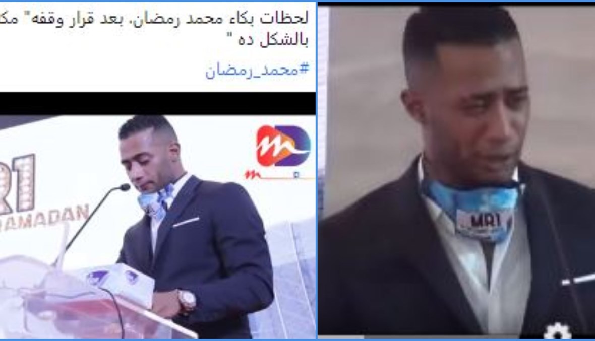 يتداول مستخدمون لوسائل التواصل الاجتماعي مقطعاً مصوّراً للممثل والمطرب الشعبي المصري محمد رمضان وهو يبكي قائلا: "أنا آسف جدا..."، بمزاعم انها "لحظات بكائه "بعد قرار إيقافه" عن العمل، اثر نشر صور له مع مشاهير إسرائيليين أخيرا، تسببت بحملة انتقادات واسعة ضده. غير أنّ هذه المزاعم لا صحة لها. الفيديو يعود الى 8 ايلول 2020، ويظهر فيه رمضان باكيا خلال مؤتمر صحافي نُظّم يومذاك لدعم ضحايا الحروق. FactCheck#