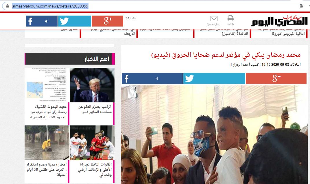 فالبحث عنه في الانترنت يقود فورا الى مواقع اخبارية عربية (مثل هنا، هنا، هنا، هنا، هنا، هنا، هنا، هنا، وهنا...) نشرته، من زاوية أخرى، في 8 ايلول 2020، ضمن تقرير عن حضور رمضان احتفال توقيع بروتوكول تعاون بينه وبين مستشفى أهل مصر لعلاج الحروق.