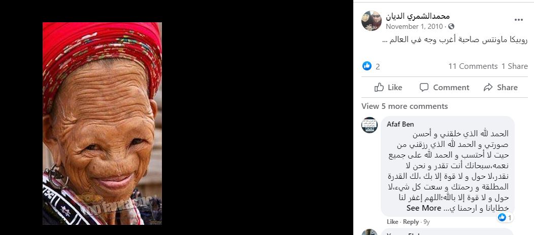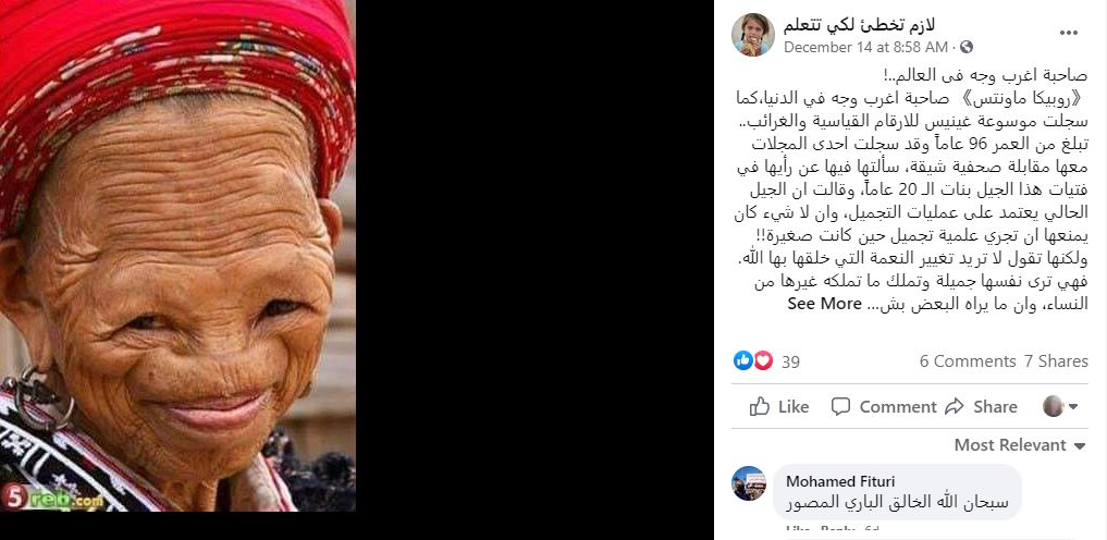 الوقائع: تظهر الصورة امرأة بملامح آسيوية وبجبين عال وكبير جدا، ومن دون أنف. التشارك في الصورة تكثف عبر حسابات وصفحات (مثل هنا، هنا، هنا، هنا، هنا...). وقد أرفقت بالمزاعم الآتية (من دون تدخل أو تصحيح): "صاحبة اغرب وجه فى العالم..!《روبيكا ماونتس》 صاحبة اغرب وجه في الدنيا،كما سجلت موسوعة غينيس للارقام القياسية والغرائب.. تبلغ من العمر 96 عاماً وقد سجلت احدى المجلات معها مقابلة صحفية شيقة، سألتها فيها عن رأيها في فتيات هذا الجيل بنات الـ 20 عاماً، وقالت ان الجيل الحالي يعتمد على عمليات التجميل، وان لا شيء كان يمنعها ان تجري علمية تجميل حين كانت صغيرة!! ولكنها تقول لا تريد تغيير النعمة التي خلقها بها الله...".