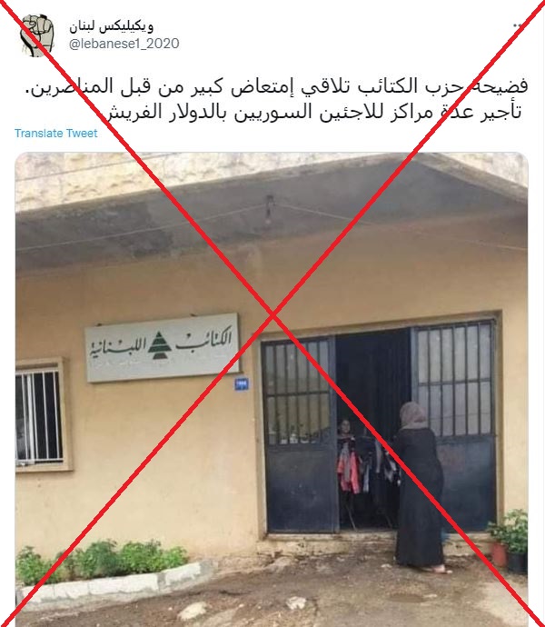 يتناقل مستخدمون لوسائل التواصل الاجتماعي في لبنان منشوراً مع صورة (هنا) بمزاعم ان "حزب الكتائب يؤجّر مراكز تابعة له للاجئين سوريين بالدولار". غير أنّ هذا الادعاء "كاذب"، بتأكيد من رئيس جهاز الاعلام في حزب الكتائب باتريك ريشا لـ"النهار"، مشيرا الى ان الصورة المتناقلة "مركّبة".