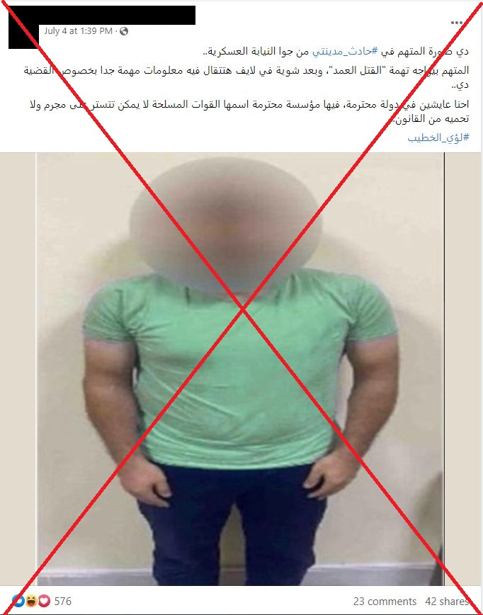 وجاء في التعليقات المرفقة "صورة المتّهم في حادث مدينتي من داخل النيابة العسكريّة".