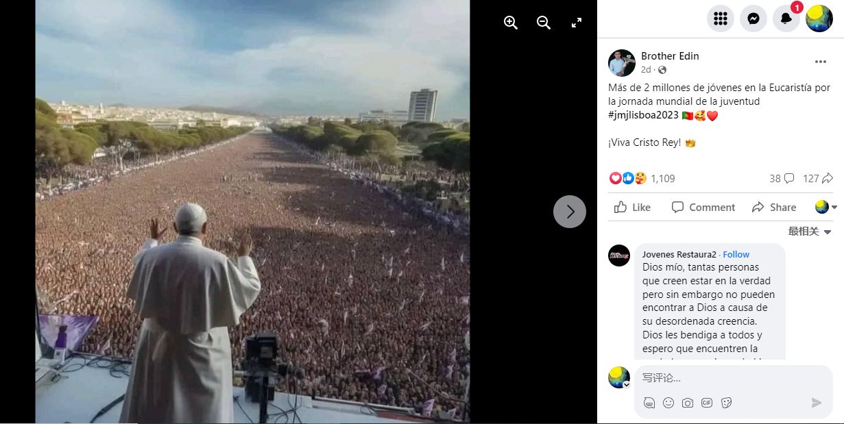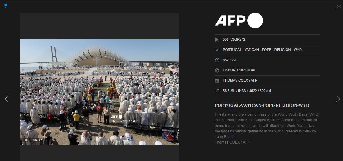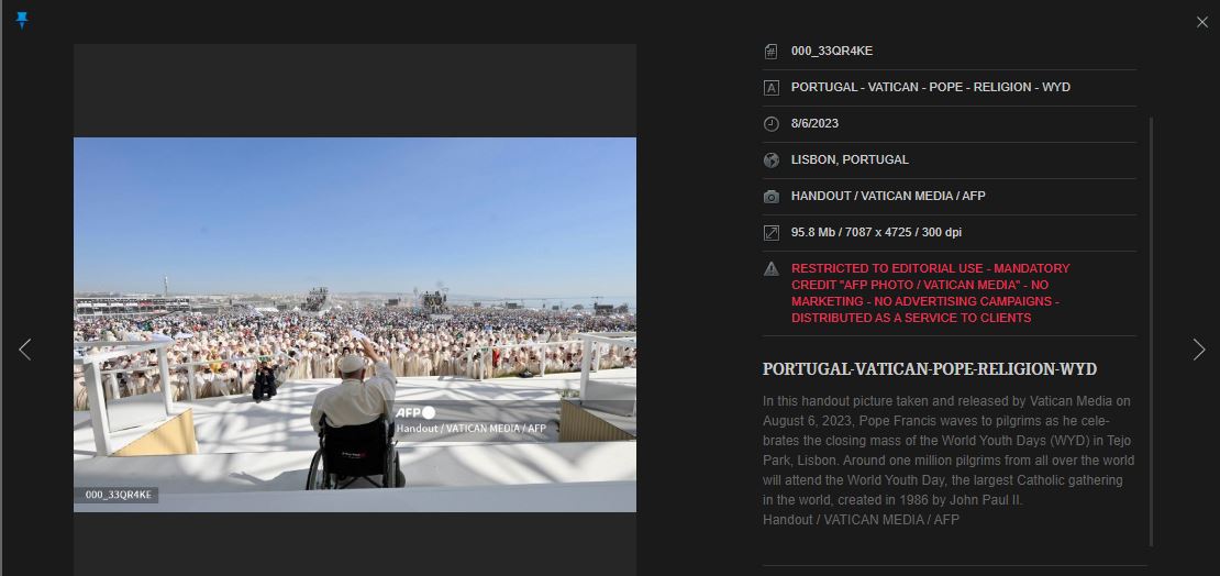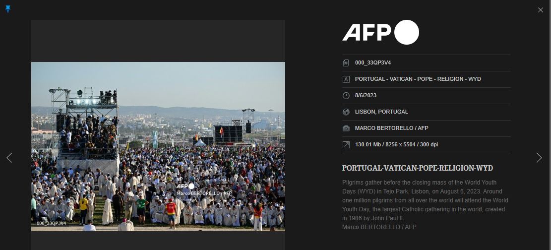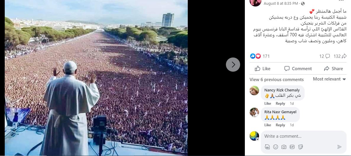 جاء تداول الصورة في وقت ترأس البابا فرنسيس، الأحد 6 آب 2023، في لشبونة القداس الختامي للأيام العالمية للشبيبة أمام مليون ونصف مليون مصلّ في اليوم الأخير من زيارته المخصصة لأكبر تجمّع كاثوليكي عالمي، على ما كتبت وكالة فرانس برس.
