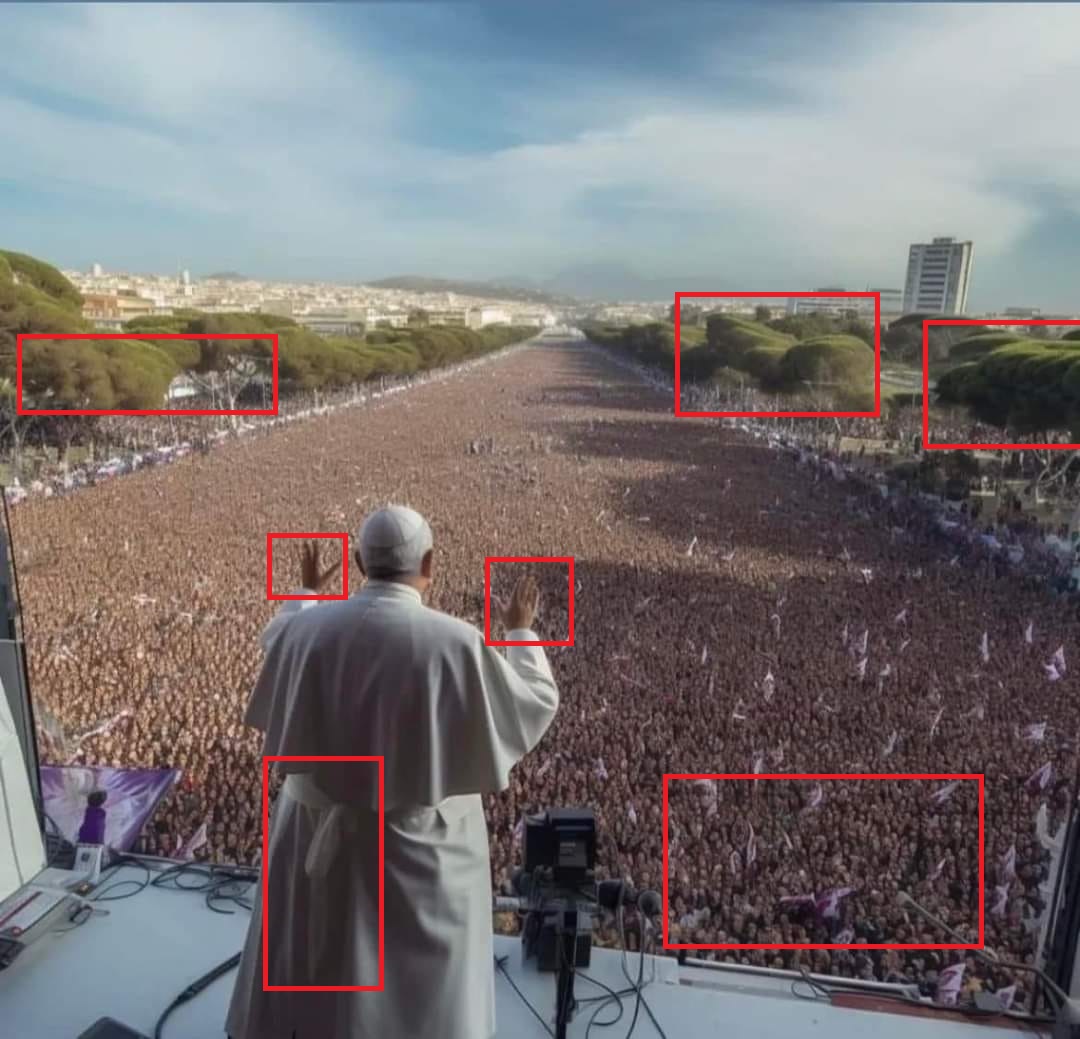 - وجوه ضبابية، غير واضحة ازدحمت امام البابا. والى الجانبين اشجار شمعية، ضبابية. وهذه التفاصيل اشرنا اليها بالأحمر في الصورة ادناه.
