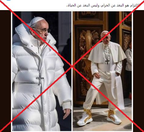 ينشغل مستخدمون لوسائل التواصل الاجتماعي بصورتين للبابا فرنسيس بمزاعم انهما تظهرانه "بازياء عصرية أطل بها أخيرا"، وذلك لكون "الالتزام هو ليس البعد عن الحياة، بل البعد عن الحرام". غير أن هذا الزعم غير صحيح، لكون الصورتين منشأتين بواسطة برنامج ذكاء اصطناعي. FactCheck#