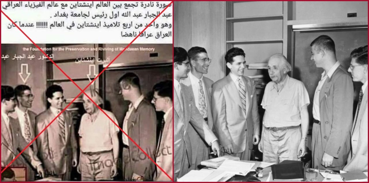 الوقائع: الصورة انتشرت أخيرا في صفحات (هنا، هنا، هنا...)، مرفقة بالمزاعم الآتية (من دون تدخل او تصحيح): "صورة نادرة تجمع بين العالم أينشتاين مع عالم الفيزياء العراقي عبد الجبار عبد الله اول رئيس لجامعة بغداد. وهو واحد من اربع تلاميذ اينشتاين في العالم !!!!!! عندما كان العراق عراقا ناهضا". وتداول الصورة قديم، بحيث سبق ان انتشرت بالمزاعم ذاتها في الاعوام الماضية (هنا، هنا، هنا، هنا، هنا، هنا، هنا، هنا، هنا...).