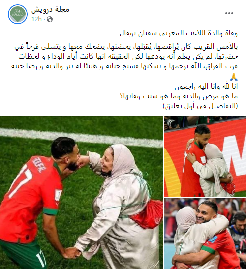 منذ ساعات، يضج الخبر في وسائل التواصل الاجتماعي، بحيث تكثف التشارك فيه عبر حسابات، وفي مواقع ايضا (هنا، هنا، هنا، هنا، هنا...). وجاء فيه (من دون تدخل او تصحيح): "وفاة والدة اللاعب المغربي سفيان بوفال. بالأمس القريب كان يُراقصها، يُقبّلها، يحضنها، يضحك معها و يتسلى فرحاً في حضرتها، لم يكن يعلم أنه يودعها لكن الحقيقة انها كانت أيام الوداع و لحظات قرب الفراق، اللّه يرحمها و يسكنها فسيح جناته...".