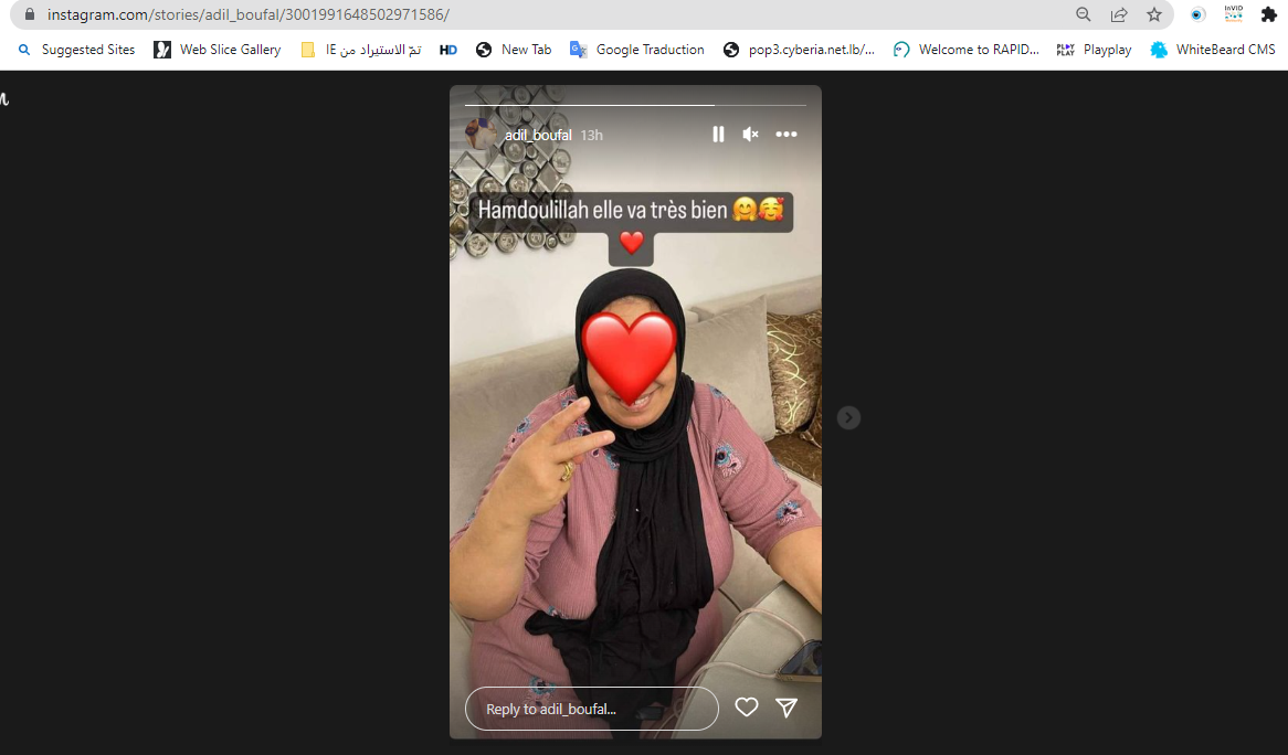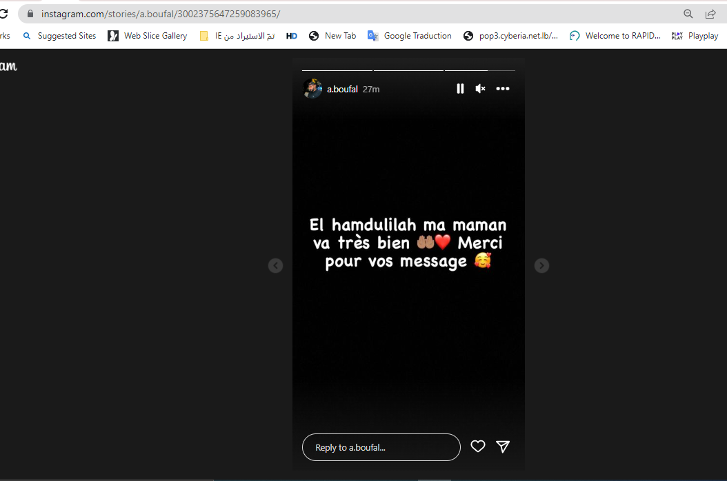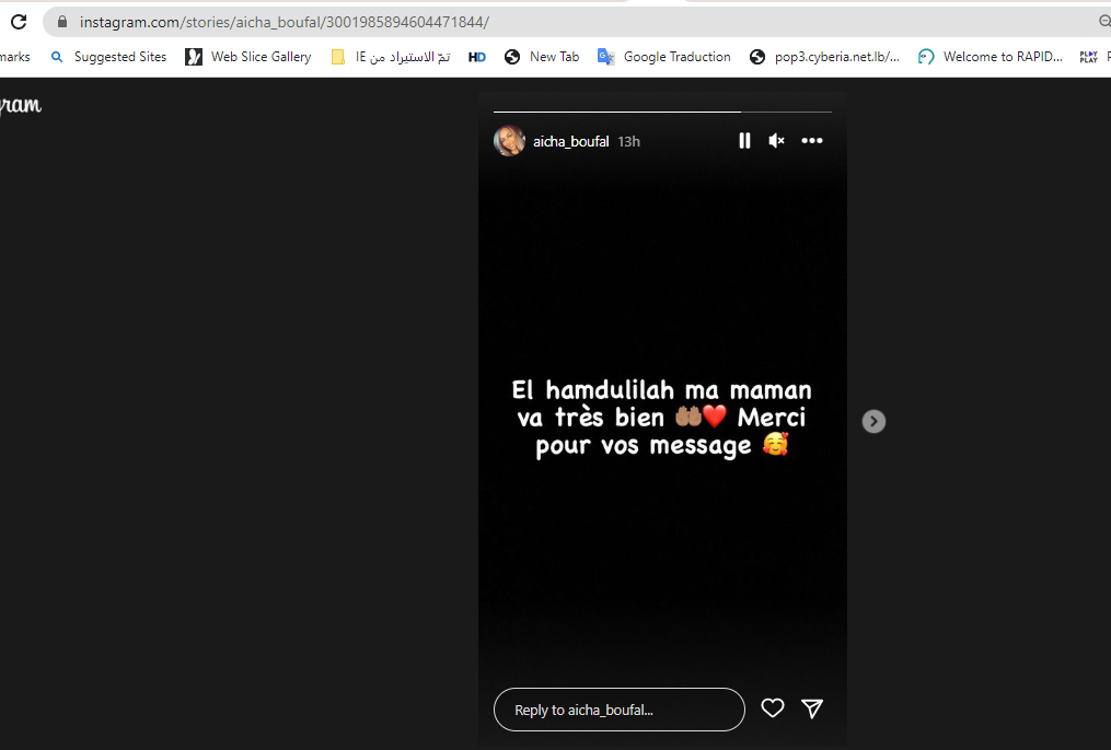 في المقابل، تم التداول بمنشور نشره حساب عائشة بوفال، "شقيقة اللاعب المغربي بوفال"، وفقا للمتداول، وذلك عبر خاصية "ستوريز" (هنا)، جاء فيه: "الحمد الله والدتي بصحة جيدة شكرا لرسائلكم".