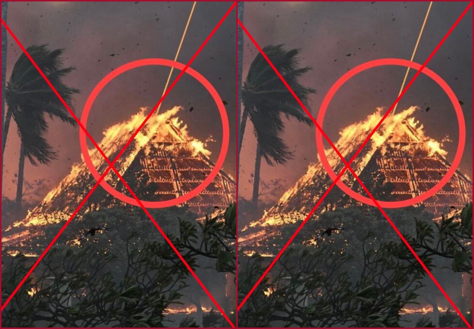 النتيجة: اذاً، لا صحة للمزاعم ان الصورة المتناقلة تظهر "شعاع لايزر مصوبا الى مبنى يحترق في هاواي، دليلا على ان حرائق هاواي مفتعلة". في الواقع الصورة مركبة، تم التلاعب بها باضافة شعاع لايزر. والصورة الاصلية تظهر قاعة كنيسة وايولا التاريخية في لاهاينا تحترق، الثلثاء 8 آب 2023. وبالطبع لا اثر فيها لشعاع لايزر.