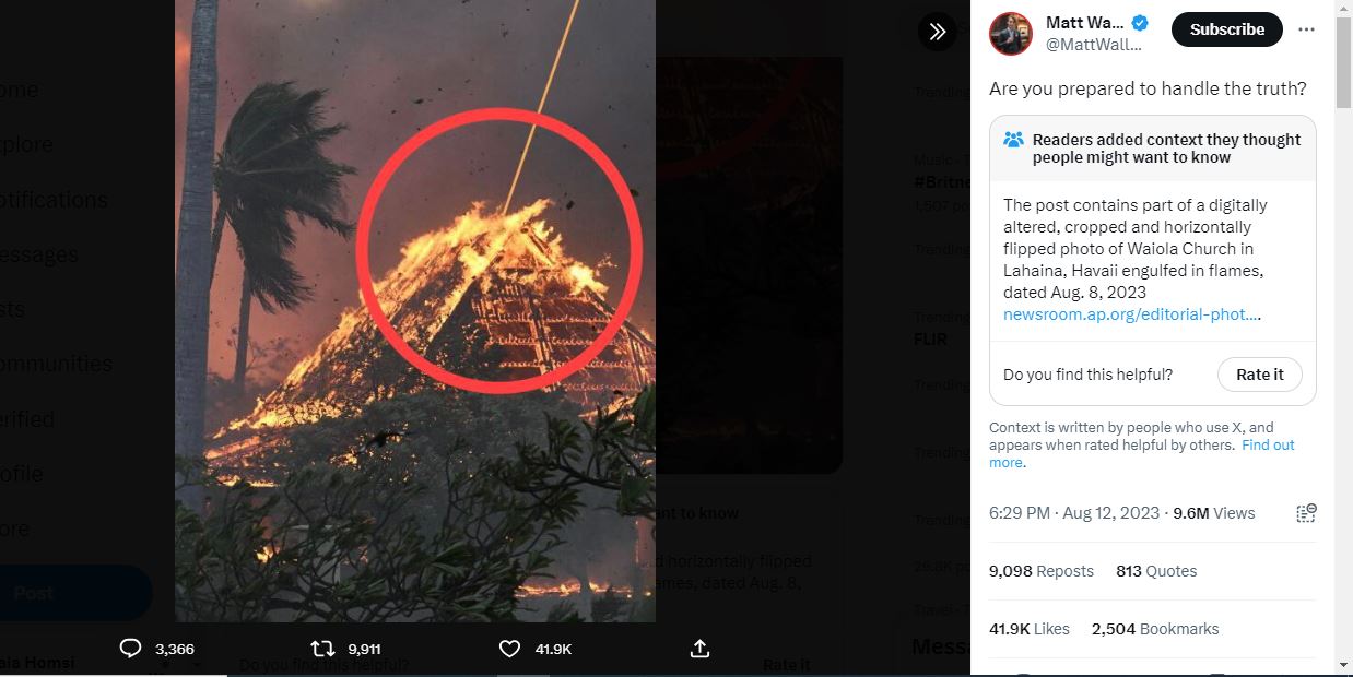 الحقيقة: الصورة مركبة، تم التلاعب بها باضافة شعاع لايزر. والصورة الاصلية تظهر قاعة كنيسة وايولا التاريخية في لاهاينا تحترق، الثلثاء 8 آب 2023. وبالطبع لا اثر فيها لشعاع لايزر. FactCheck#