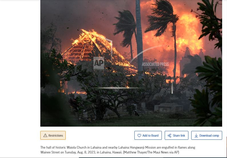 فالبحث العكسي عن الصورة يوصلنا، عبر المحرك Tineye، الى الصورة الاصلية منشورة في مواقع أخبارية (هنا...)، وما تظهره هو "نيران تلتهم قاعة كنيسة وايولا التاريخية في لاهاينا وقربها ارسالية لاهاينا هونغوانجي، في شارع وايني، في لاهاينا بهاواي، الثلثاء 8 آب 2023"، وفقا لما أوردت معها وكالة "اسوشيتد برس" الاميركية، ناشرتها (هنا، هنا).