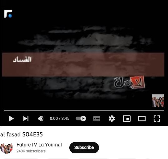 فالبحث عن الفيديو، بتجزئته الى مشاهد ثابتة (Invid)، يقودنا عبر محرك Yandex، الى خيوط (هنا)، توصلنا اليه منشوراً في حساب البرنامج الفكاهي اللبناني الساخر "لا يُمل"- FutureTV La Youmal- في يوتيوب، في 3 آب 2013، (هنا)، بعنوان: الفساد، الحلقة 35 الموسم 04/ Al Fasad S04E35.