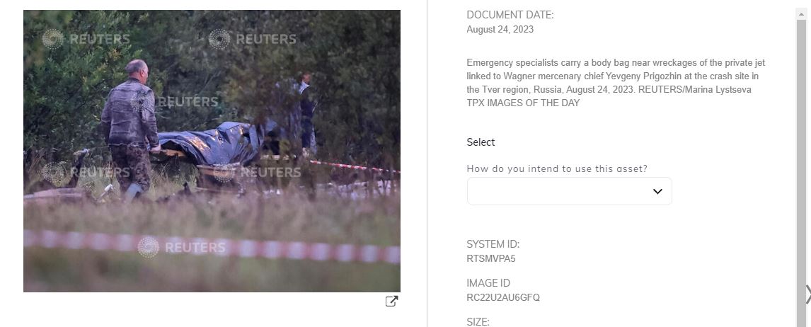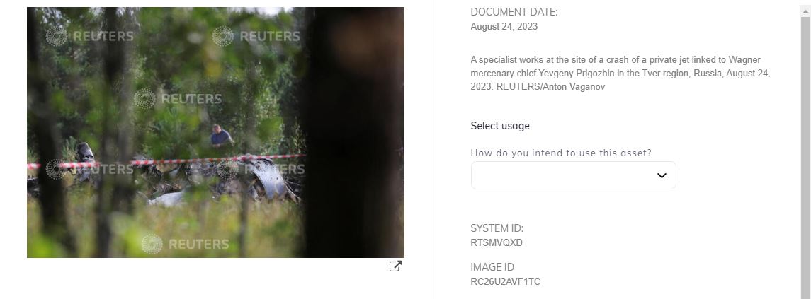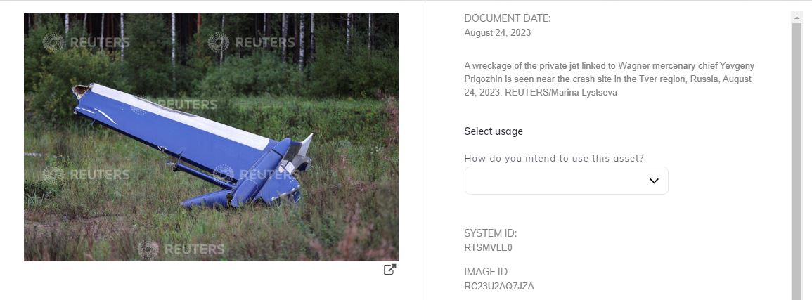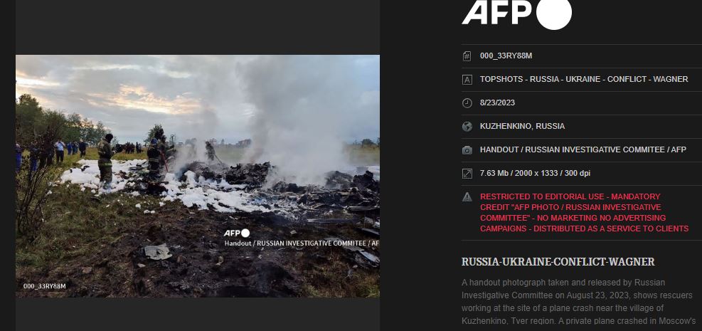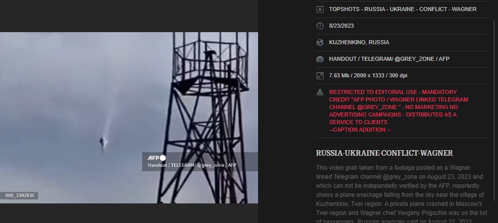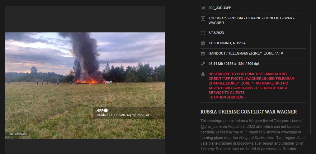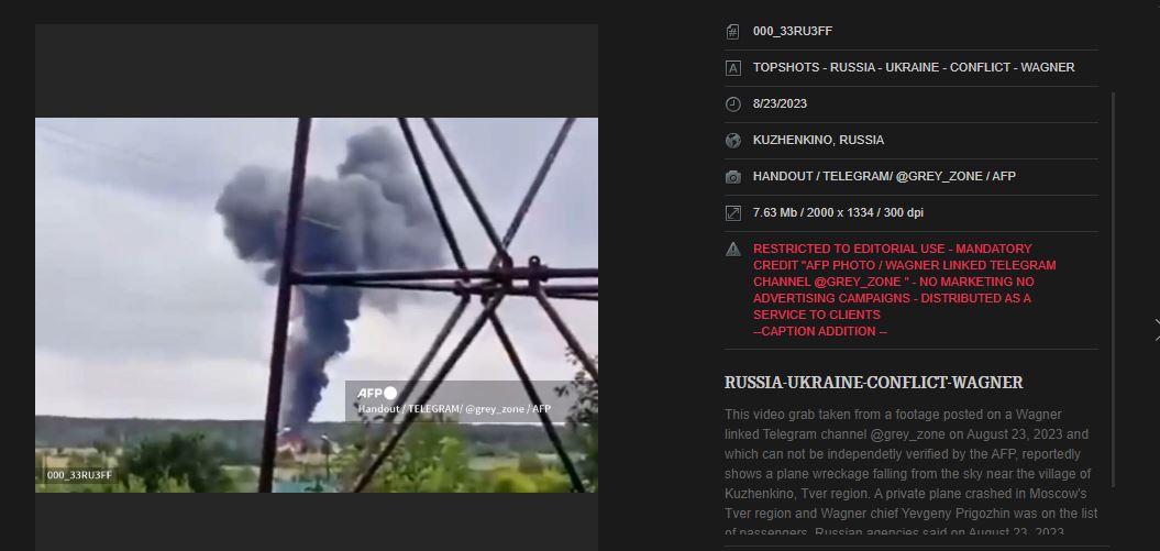 بعد اعلان تحطم طائرة قائد "فاغنر" يفغيني بريغوجين في روسيا، انتشرت مشاهد ولقطات لها (هنا grey_zone@)، (وهنا وكالة "اسوشيتد برس"، وهنا "رويترز")، بينما وزعت وكالة "فرانس برس" لقطات من فيديوات نشرها حساب grey_zone@، مشيرة الى انها لم تتمكن من التحقق منها بشكل مستقل.