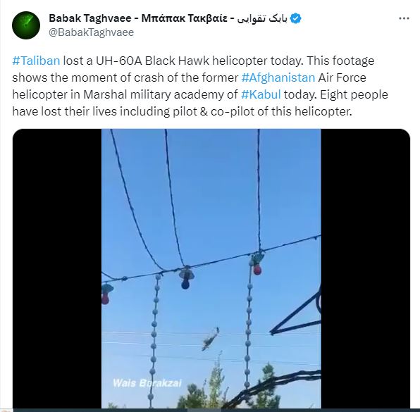 ونقلت وكالة "رويترز"، عن وزارة الدفاع التابعة لطالبان، في خبر في 10 ايلول 2022 (هنا، هنا ايضا)، إن طائرة هليكوبتر من طراز بلاك هوك تحطمت خلال تدريب لحركة طالبان في العاصمة الأفغانية كابول، الامر الذي أسفر عن مقتل ثلاثة أشخاص.