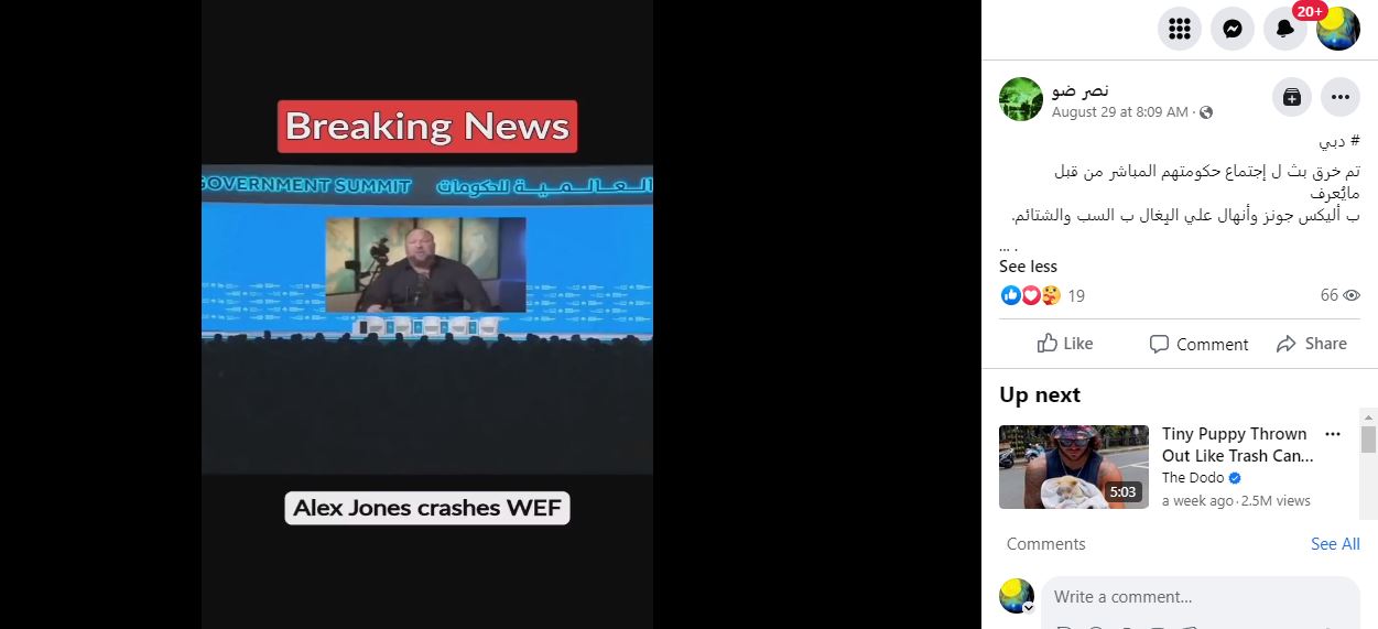 وقد تكثف التشارك في الفيديو أخيرا، عبر حسابات ارفقته بالمزاعم الآتية (من دون تدخل او تصحيح): "خلال القمة العالمية للحكومات في دبي تمّ خرق البث المباشر من قبل أليكس جونز وأنهال عليهم بالشتائم".