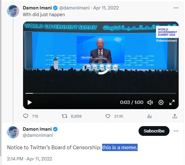 كلمة مفتاح اساسية تقودنا إلى المنتج الايراني دايمون ايماني Damon Imani، الذي انجز الفيديو ونشره في حسابه في اكس في 11 نيسان 2022 (هنا، وهنا)، وفي حسابه في Rumble (هنا). وارفقه بعنوان اي Alex Jones On World Government Summit 2022 اي أليكس جونز في القمة العالمية للحكومات 2022. ونبّه الى ان الفيديو "ميم" (هنا).
