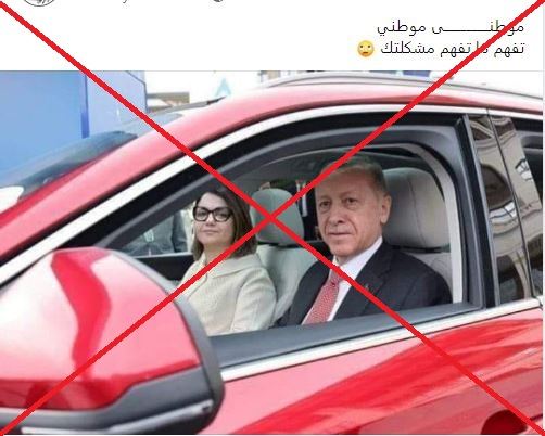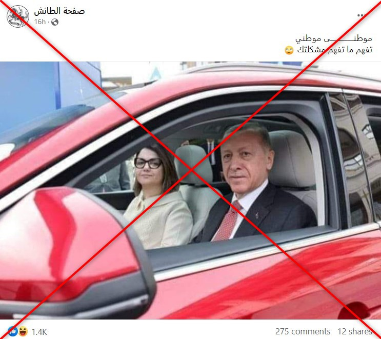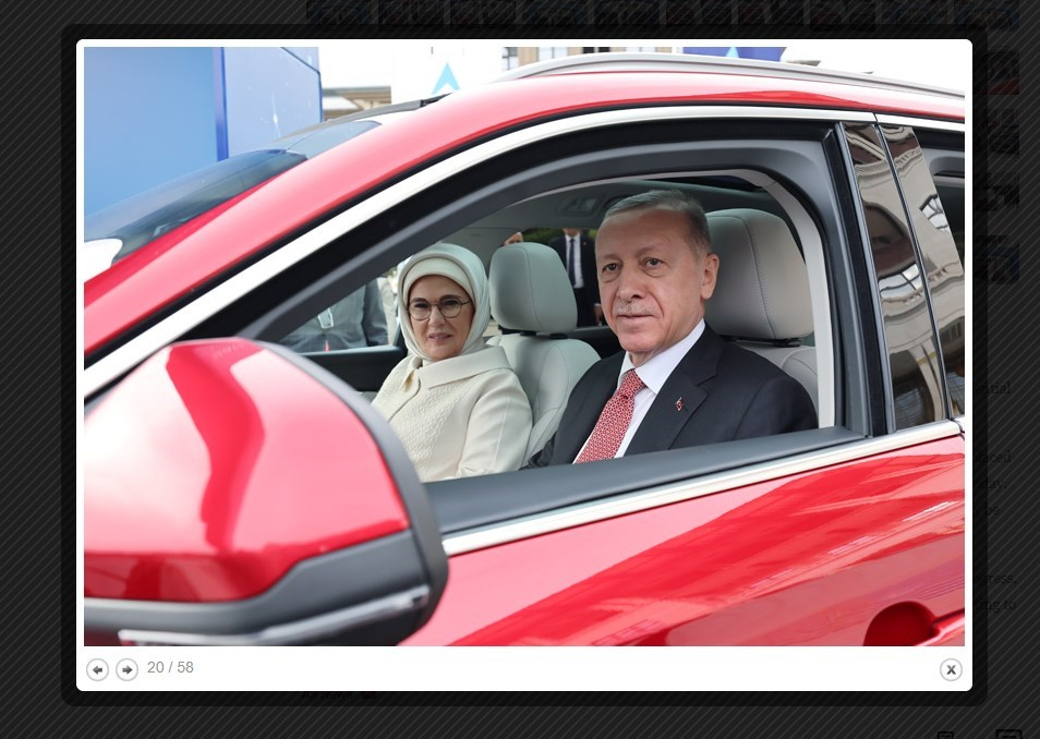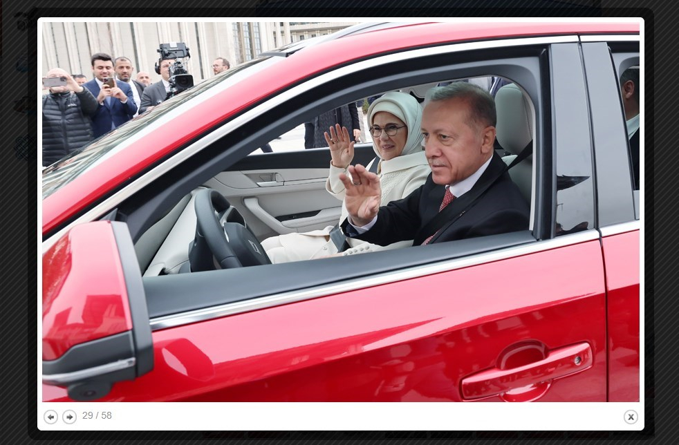 والتقطت هذه الصورة خلال استلام الرئيس التركي سيارة محليّة الصنع في القصر الرئاسيّ، ويمكن مشاهدة لقطات أخرى تظهر إردوغان وزوجته خلال قيادة السيّارة.