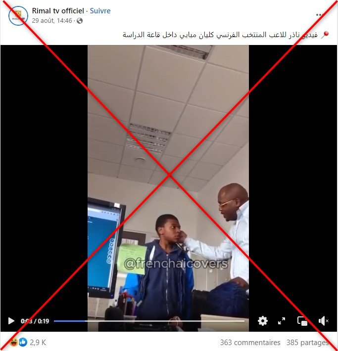 تداولت صفحات على مواقع التواصل الاجتماعي مقطع فيديو زعمت أنه يُظهر مشاهد نادرة للاّعب الفرنسي كيليان مبابي وهو يتلقى توبيخاً من مدرّسه حينما كان تلميذاً. لكن الفيديو مركّب باستخدام تقنيات الذكاء الاصطناعي. ومن يظهر في الفيديو الأصلي طفل لا علاقة له بمبابي.