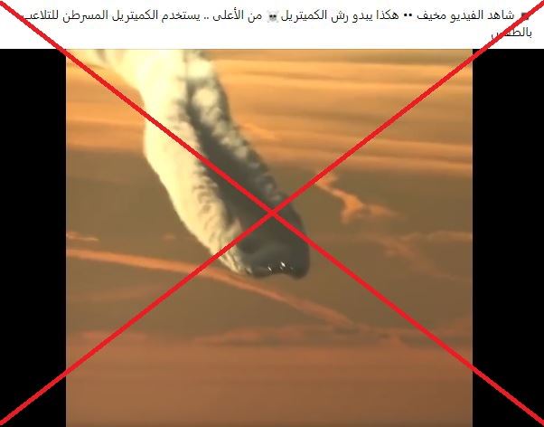 المشاهد تظهر طائرة تحلّق، بينما تشكلت وراءها غيوم كثيفة. وقد تكثف التشارك في الفيديو أخيرا، عبر حسابات ارفقته بالمزاعم الآتية (من دون تدخل او تصحيح): "شاهد، هكذا يبدو رش الكميتريل من الأعلى... يستخدم الكميتريل المسرطن للتلاعب بالطقس".