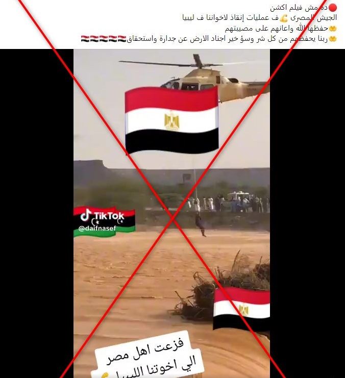 تداول مستخدمون لمواقع التواصل الاجتماعي فيديو زعم ناشروه أنّه لفريقٍ من الجيش المصريّ ينقذ طفلاً عالقاً وسط السيول في ليبيا. صحيح أنّ السلطات المصريّة أرسلت مساعدات ومعدات عسكريّة إلى هذا البلد المجاور المنكوب، إلا أنّ الفيديو يعود لإنقاذ طفلٍ في موريتانيا عام 2022.