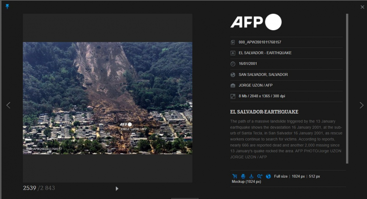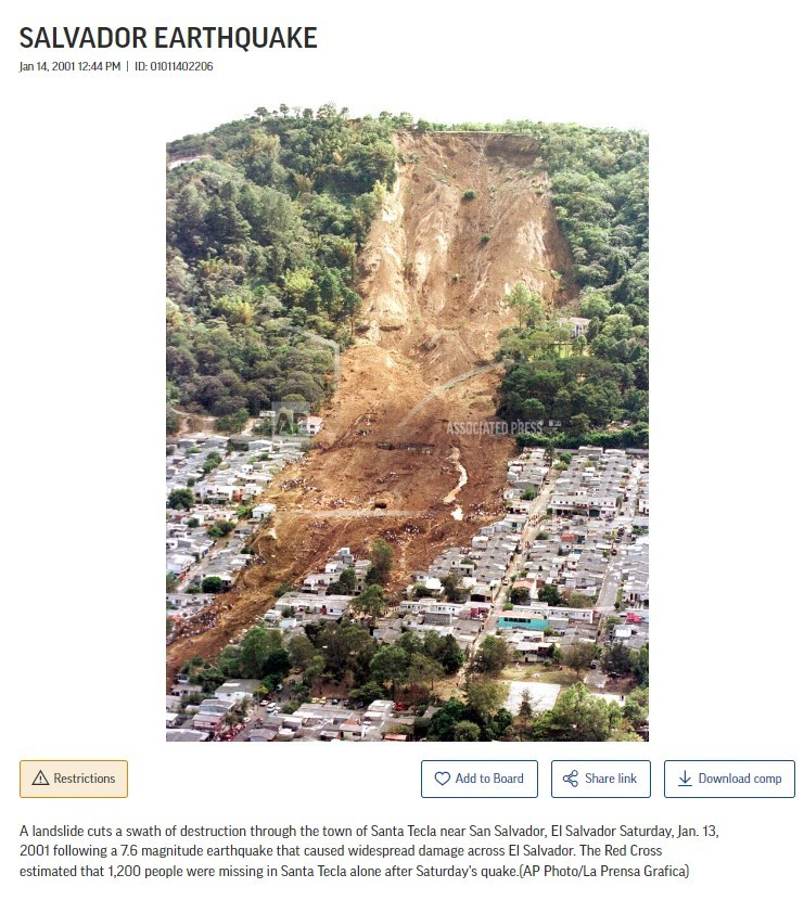وقالت الوكالة إن الصورة توثّق انهيار أراضٍ في ضاحية سانتا تيكلا في السلفادور في أعقاب الزلزال المدمّر الذي شهده البلد آنذاك، في كانون الثاني 2001.