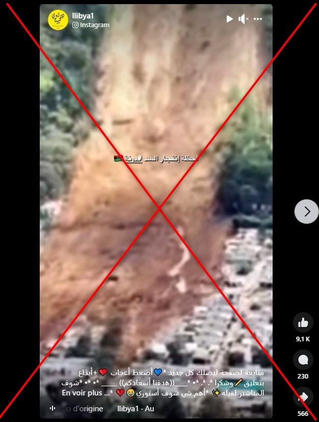 بعد مرور أيامٍ على الفيضانات الناجمة عن انهيار سدّين في درنة شرق ليبيا تحت ضغط الأمطار الغزيرة التي حملتها العاصفة دانيال في 10 أيلول، نشرت صفحات على مواقع التواصل الاجتماعي فيديو زعمت أنه يُظهر لحظة انفجار أحد هذين السدّين في مدينة درنة. لكن الادعاء مضلّل، والفيديو معدّل عن صورة لانهيار أرضي خلال زلزال وقع في السلفادور عام 2001.