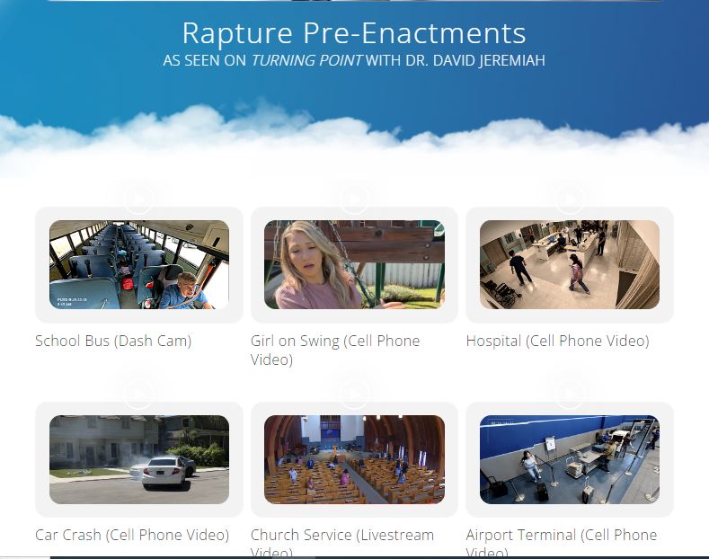كذلك، يسوّق موقع القس جيريميا (هنا) هذه الفيديوات الدرامية المسبقة للاختطاف (Rapture Pre-Enactment videos)، و"التي تتعمق في الحدث الغامض المرتقب"، على قوله. ويشير الى ان "هذه اللقطات تم تصويرها بواسطة أجهزة مختلفة، وتهدف الى إثارة الفضول والمناقشة".