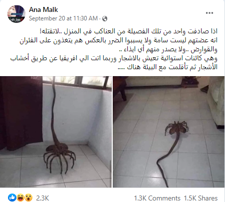 تنتشر في مواقع التواصل الاجتماعي صورتان بمزاعم انهما تظهران "فصيلة غير سامة ونادرة من العناكب بذيل طويل في أوستراليا". غير أنّ هذا الكلام غير صحيح. فما يظهر في الصورتين، ليس عكنبوتا حقيقيا، بل دمية مستوحاة من الكائن الفضائي الخيالي "Facehugger" (او معانق الوجه) في أفلام الخيال العلمي Alien (فضائي) الشهيرة. FactCheck#