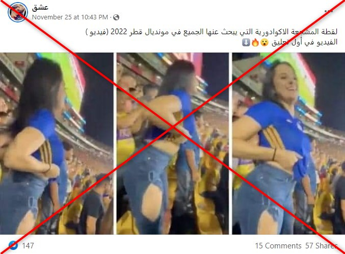 تداول مستخدمون لمواقع التواصل الاجتماعي صورة لسيّدة تخلع قميصها في المدرّجات، زاعمين أنّها لمشجّعة إكوادوريّة تحتفل خلال مباراة لمنتخب بلادها في منافسات مونديال قطر 2022. إلا أنّ الصورة في الحقيقة تعود لمشجّعة خلال مباراة في المكسيك قبل شهر من انطلاق منافسات كأس العالم.