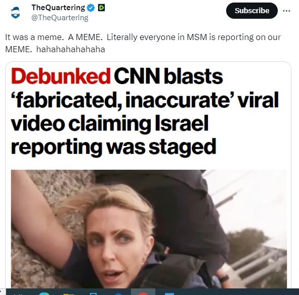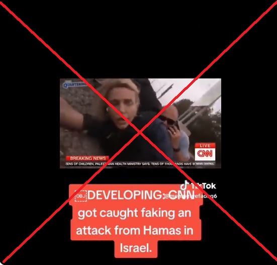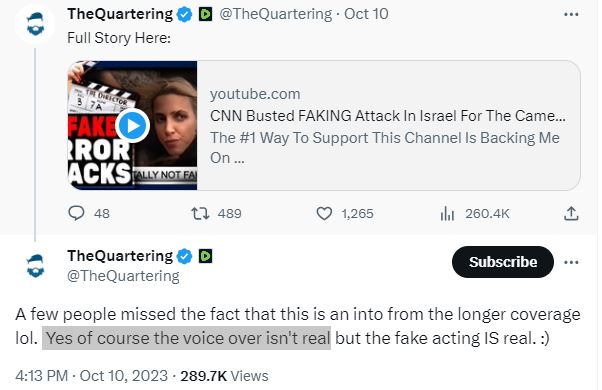 الحقيقة: "صوت المخرج المزعوم" في الفيديو مركّب، وكلامه مختلق. والدليل على ذلك المشاهد الاصلية التي عرضتها شبكة "سي ان ان" الاميركية في 9 تشرين الاول 2023، وتظهر "فريقها يتفادى وابلاً من الصواريخ بالقرب من الحدود بين إسرائيل وغزة". كذلك، اقرّ حساب The Quartering، مصدر الفيديو المتناقل، بأن الصوت فيه ليس حقيقيا. FactCheck#