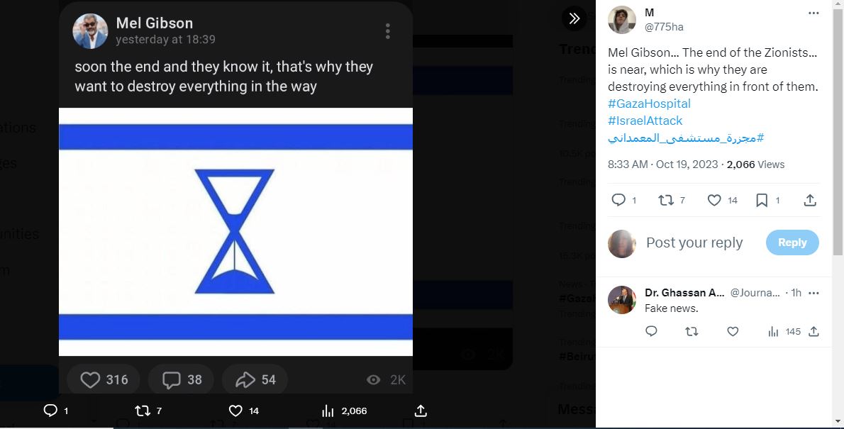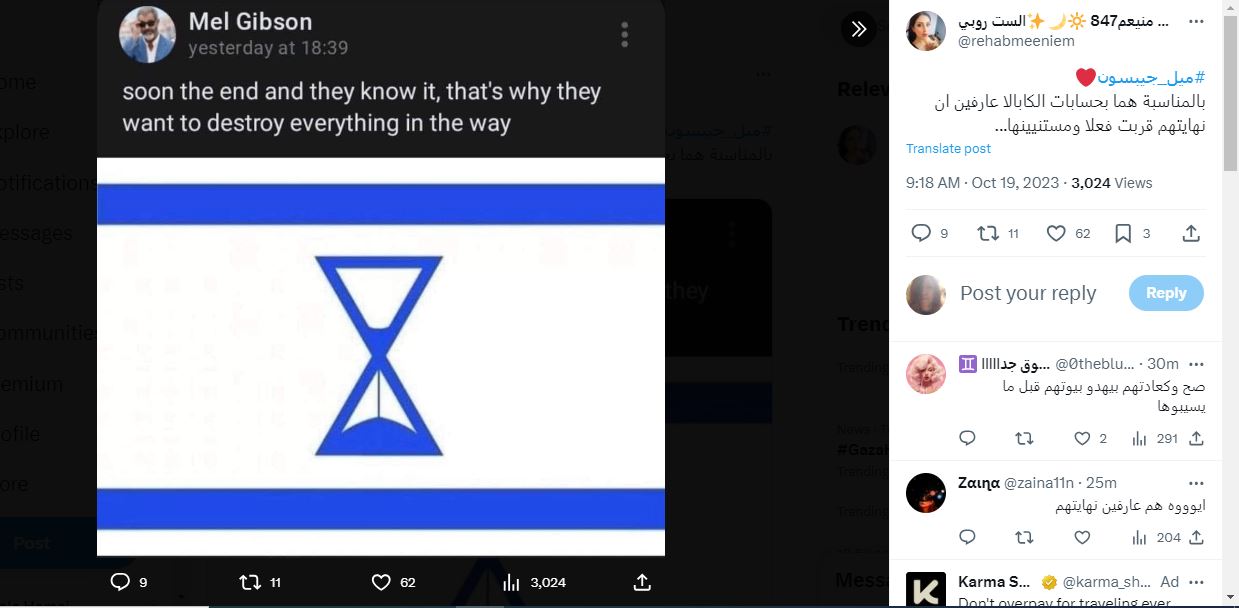 لقطة من منشور حمل اسم النجم الاميركي ميل غيبسون Mel Gibson مع صورة له. وجاء فيه بالانكليزية: Soon the end and they know it, that's why they want to destroy everything in the way اي النهاية قريبة، وهم يعرفون ذلك. لهذا السبب يريدون تدمير كل شيء في طريقهم. وقد ارفق بصورة لعلم ساعة رملية لإسرائيل (Israel hourglass flag)، بما يؤشر الى ان المنشور كان يعني الاسرائيليين او الصهاينة. وقد تكثف التشارك فيه في الساعات الماضية عبر حسابات، عربية وأجنبية، وتفاعل معه مستخدمون بتعليقات مختلفة.