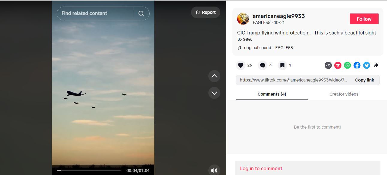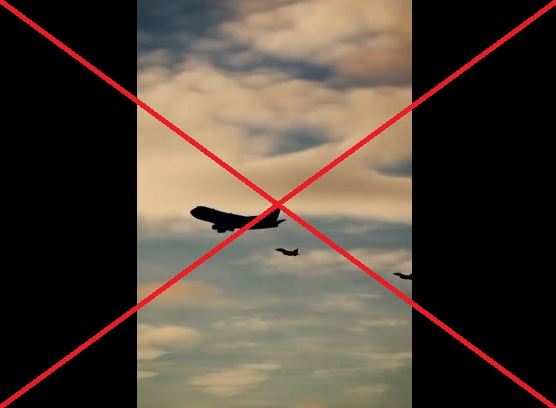 المشاهد تظهر طائرة وهي تنطلق في السماء، بينما رافقتها طائرات حربية عدة. وقد تكثف التشارك في الفيديو أخيرا، عبر حسابات ارفقته بالمزاعم الآتية (من دون تدخل): "المواكبة الأمنية للرئيس دونالد ترامب في السماء".