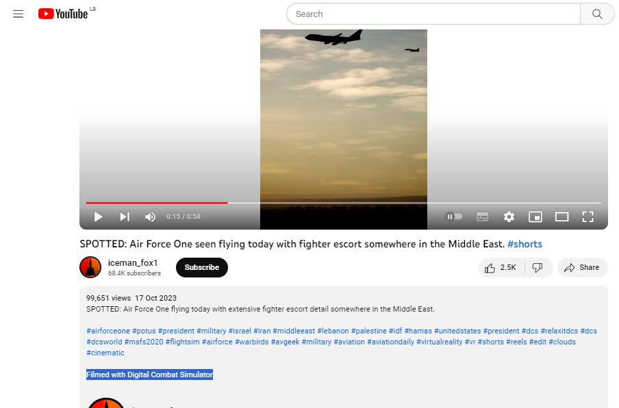 فالبحث عن الفيديو، بتجزئته الى مشاهد ثابتة (Invid)، يقودنا فورا اليه منشورا في حسابات iceman_fox1@ في يوتيوب وتيك توك وانستغرام، في 17 تشرين الاول 2023 (هنا، هنا، هنا)، بعنوان: SPOTTED: Air Force One seen flying today with fighter escort somewhere in the Middle East، اي شوهدت طائرة الرئاسة الاميركية وهي تحلق اليوم بمرافقة مقاتلة في مكان ما في الشرق الأوسط.