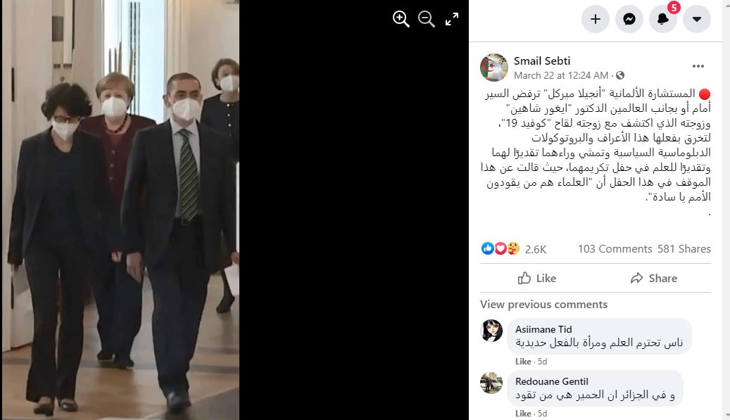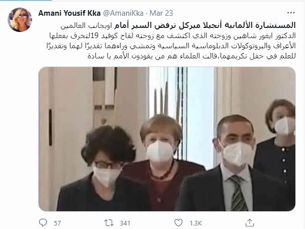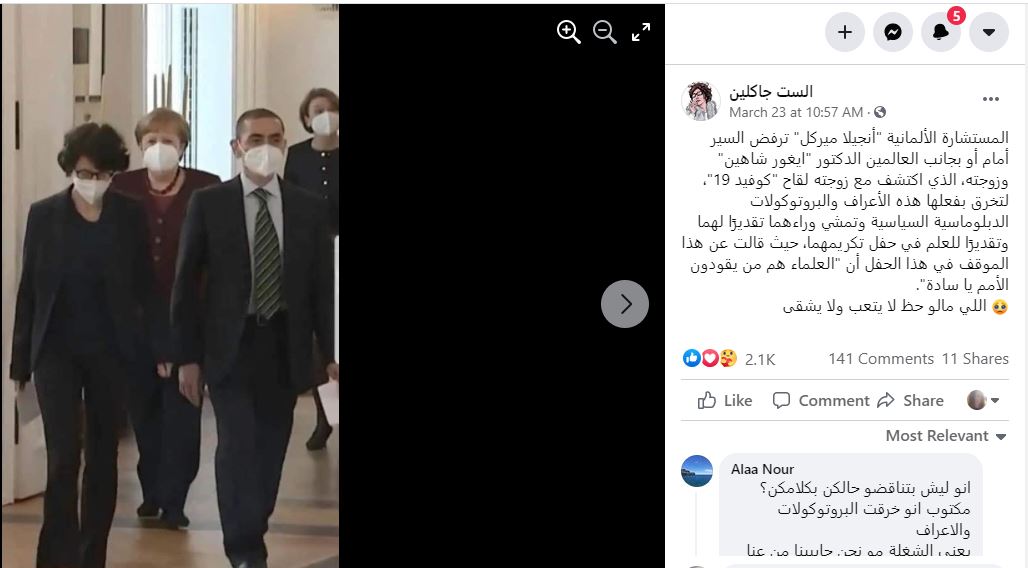 الوقائع: تظهر ميركل في الصورة وهي تمشي خلف مؤسسي شركة بايونتك الألمانية للأدوية، العالمين أوغور شاهين وزوجته أوزليم توريشي. وقد تكثف التشارك فيها أخيرا، على نطاق واسع، عبر صفحات وحسابات، في الفيسبوك (هنا، هنا، هنا، هنا، هنا...)، وتويتر (هنا، هنا، هنا، هنا...). وقد أُرفقت بالمزاعم الآتية (من دون تدخل أو تصحيح): "المستشارة الألمانية "أنجيلا ميركل" ترفض السير أمام أو بجانب العالمين الدكتور "ايغور شاهين" وزوجته الذي اكتشف مع زوجته لقاح "كوفيد 19"، لتمشي وراءهما تقديرًا لهما وتقديرًا للعلماء في حفل تكريمهما، حيث قالت عن هذا الموقف في هذا الحفل أن "العلماء هم من يقودون الأمم يا سادة".