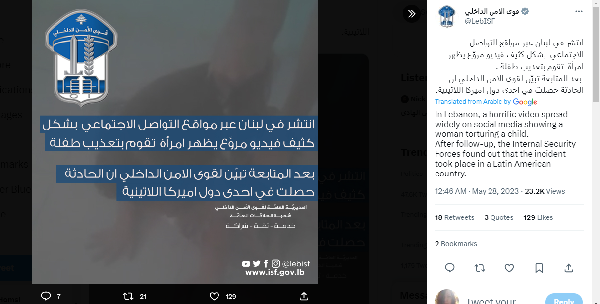 وقالت: "انتشر في لبنان، عبر مواقع التواصل الاجتماعي  بشكل كثيف فيديو مروّع يظهر امرأة تقوم بتعذيب طفلة. وبعد المتابعة تبيّن لقوى الامن الداخلي ان الحادثة حصلت في احدى دول اميركا اللاتينية".