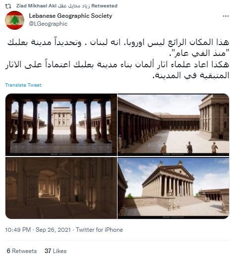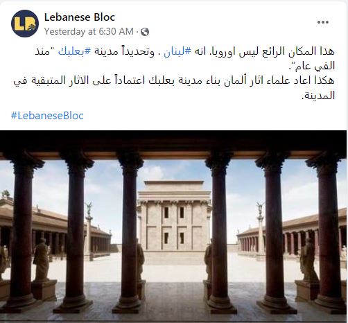 الوقائع: تظهر الصور مباني وهياكل متكاملة، ارتفعت على أعمدة جديدة، وتوزعت فيها التماثيل. وهي تنتشر في صفحات وحسابات، خصوصا لبنانية، في الفايسبوك (هنا، هنا، هنا...)، وتويتر (هنا...)، مرفقة بالمزاعم الآتية (من دون تدخل أو تصحيح): "هذا المكان الرائع ليس اوروبا. انه لبنان. وتحديداً مدينة بعلبك "منذ الفي عام". هكذا اعاد علماء اثار ألمان بناء مدينة بعلبك اعتماداً على الاثار المتبقية في المدينة".
