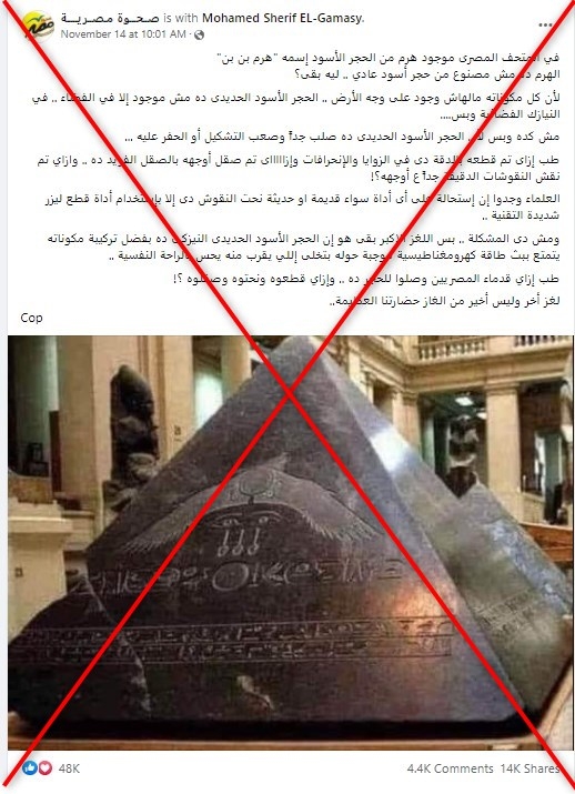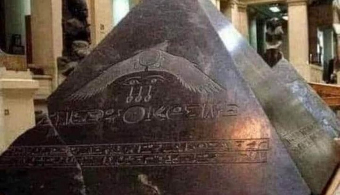 وشرحت أن ما يظهر في المنشورات المضلّلة هو هُريم "Pyramidion" كما يسمّى في علم المصريات أي قمّة هرم.