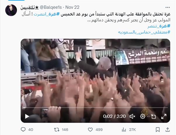 المتداول: تقرير إخباري لقناة "الجزيرة" يظهر، وفقا للمزاعم، "فلسطينيين يحتفلون في غزة بإعلان وقف اطلاق النار" مع اسرائيل، بموجب اتفاق معها على هدنة واطلاق رهائن وأسرى، وبدأ سريانه اليوم الجمعة.