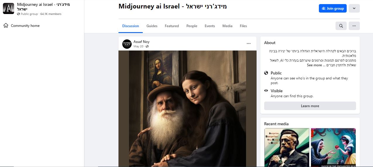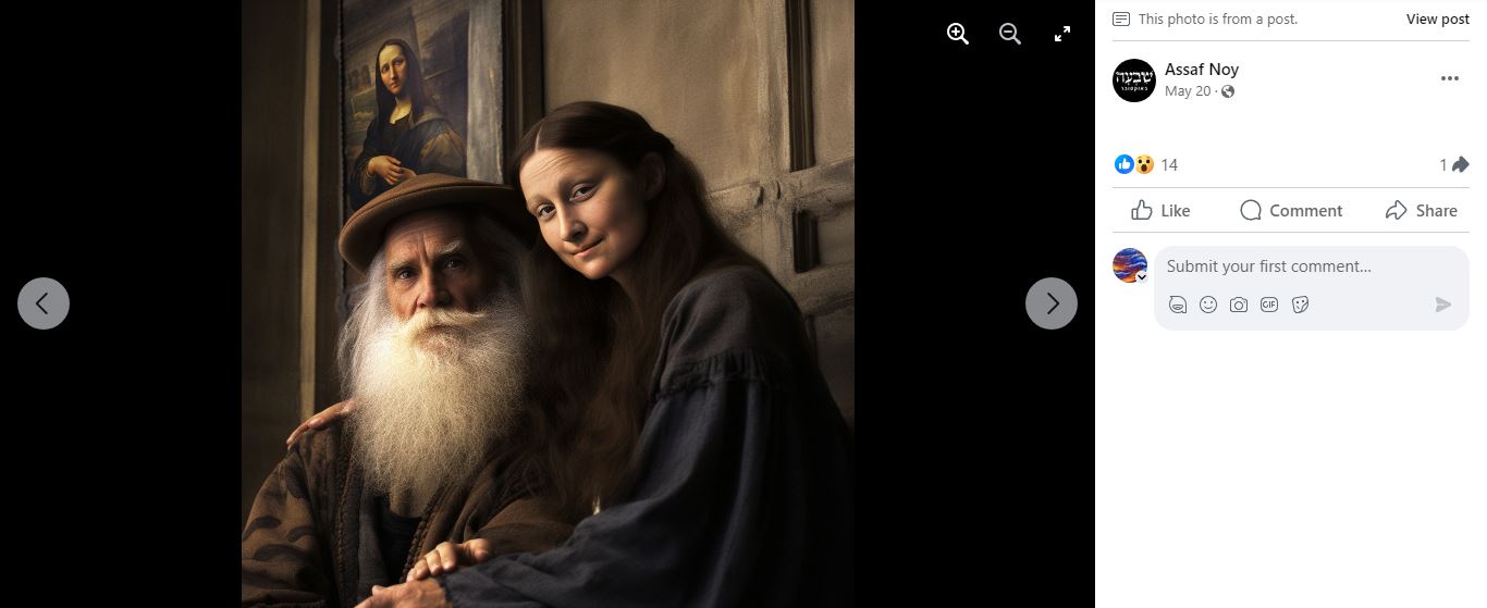 وتوصلنا خيوط اليها منشورة في 20 ايار 2023 في صفحة متخصصة بالصور المنشأة بواسطة برنامج ميدجورني Midjourney للذكاء الاصطناعي، في الفايسبوك (هنا، وهنا ايضا). وناشرها هو اساف نوي Assaf Noy.
