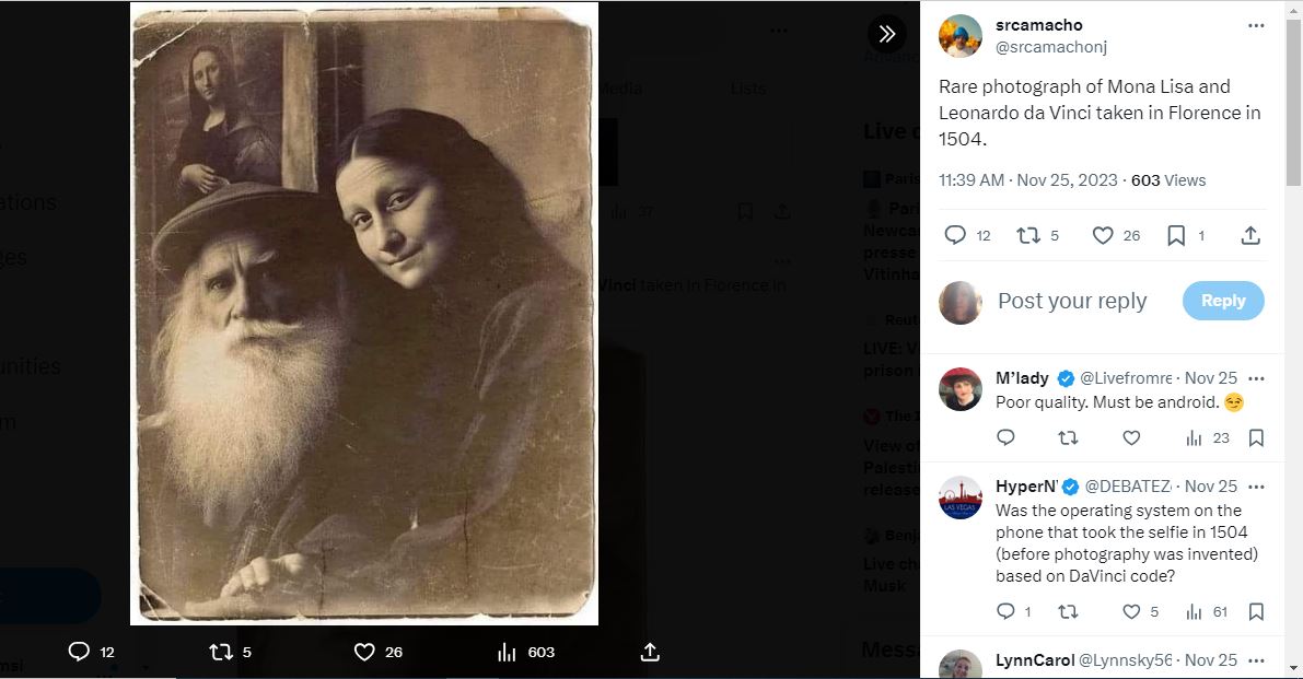 ضجة حول صورة في وسائل التواصل الاجتماعي، والتشارك فيها على نطاق واسع. فهي "نادرة وقديمة"، بتعبير مستخدمين، وتظهر "الموناليزا وليوناردو دافنشي" معاً في لقطة لهما "في فلورنسا عام 1504"، وفقا للمزاعم. والتفاعل معها يحصد اعجابا كبيرا ومئات التعليقات.
