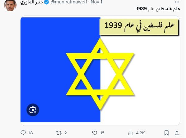 وشرح أن العلم المنشور في وسائل التواصل الاجتماعي، والذي يحمل نجمة داود، هو "أحد الأمثلة العديدة للحركات الصهيونية في المنطقة"، مشيرا الى أن "الحركة الوطنية الفلسطينية كان لها أيضا علمها الخاص في ذلك الوقت، مثل علم الشريف حسين الحالي، ولكن بنجمة".