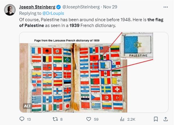 المتداول: صورتان تظهران، وفقا للمزاعم، "علم فلسطين الرسمي عام 1939، تتوسّطه نجمة داود، كما نشره قاموس لاروس الفرنسي في نسخة قديمة منه".